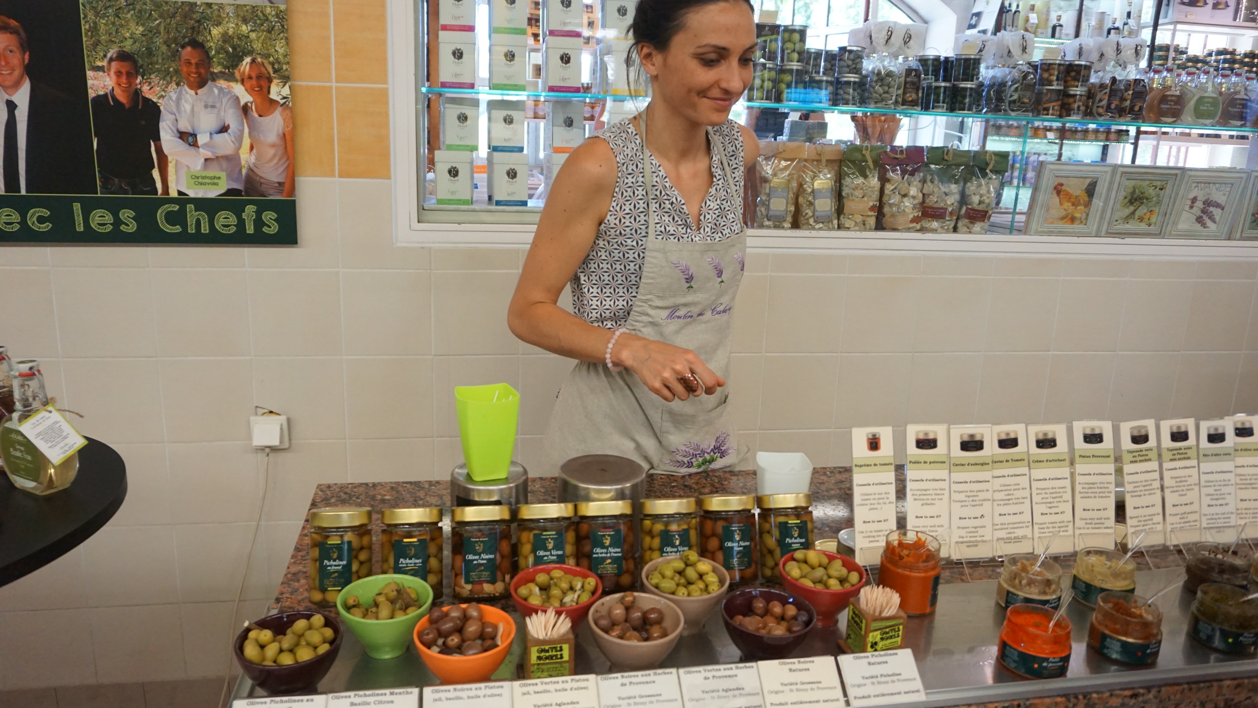 Previous Image Next Image Olive oil tasting at Moulin du Calanquet, St. Remy Offer an olive branch…or a bunch of olives! Olive oil tasting at Moulin du Calanquet, St. Remy in Provence France
